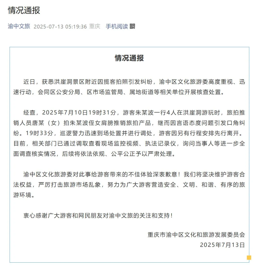 7月13日清晨,“渝中文旅”官方微信公众号发布情况通报。