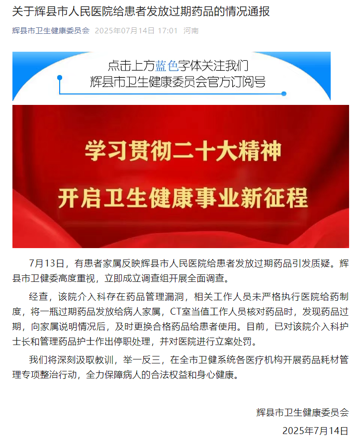7月13日,有患者家属反映辉县市人民医院给患者发放过期药品引发质疑。辉县市卫健委高度重视,立即成立调查组开展全面调查。