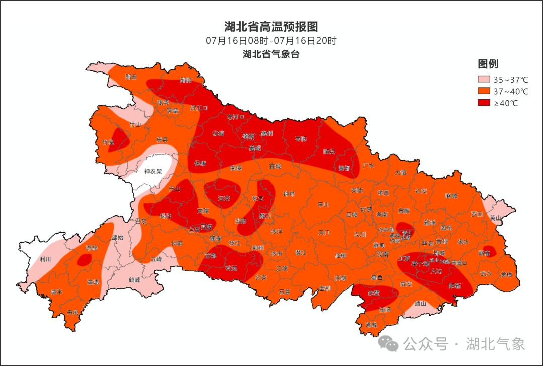 预计16日白天,除鄂西高海拔山区外,我省大部分地区最高气温将升至37℃以上,其中十堰、襄阳、宜昌、恩施、荆州、荆门、随州、武汉、黄冈、黄石、鄂州、咸宁等地可达39~40℃,十堰、襄阳、随州、宜昌、咸宁局地42℃以上,请注意防范。