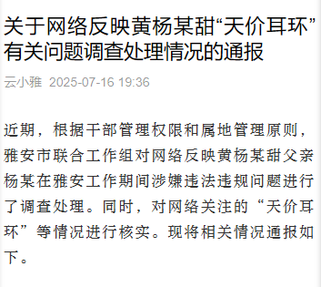 近期,根据干部管理权限和属地管理原则,雅安市联合工作组对网络反映黄杨某甜父亲杨某在雅安工作期间涉嫌违法违规问题进行了调查处理。同时,对网络关注的“天价耳环”等情况进行核实。现将相关情况通报如下。