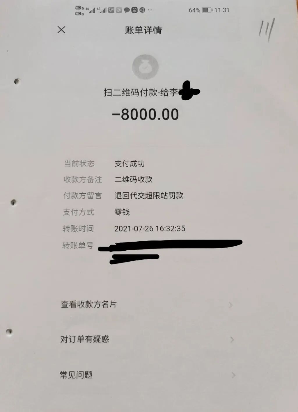 杜虎将8000元罚款转给李某商贸公司人员