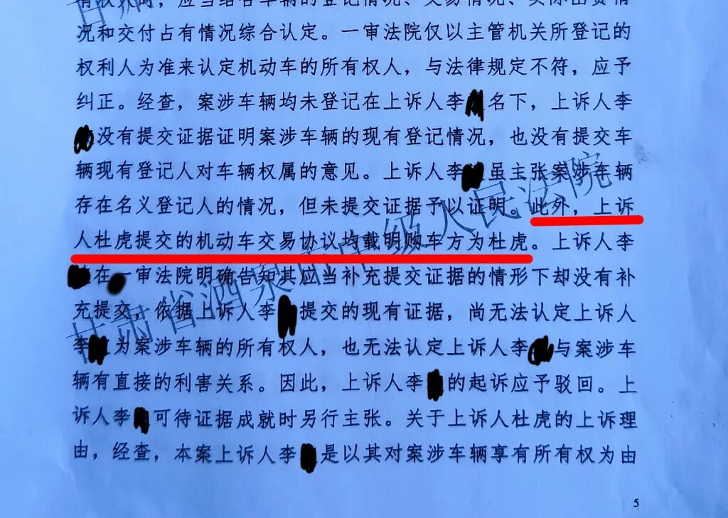 杜虎认为,酒泉中院二审生效裁定证明,车辆并非登记在李某的代理货运部或商贸公司名下,却被李某派人持未生效的一审裁定将车领走,超限站明显有错。其次,二审生效裁定载明,法院根据机动车交易协议查明,购车方是杜虎,但交通局却不认可,属于推诿。