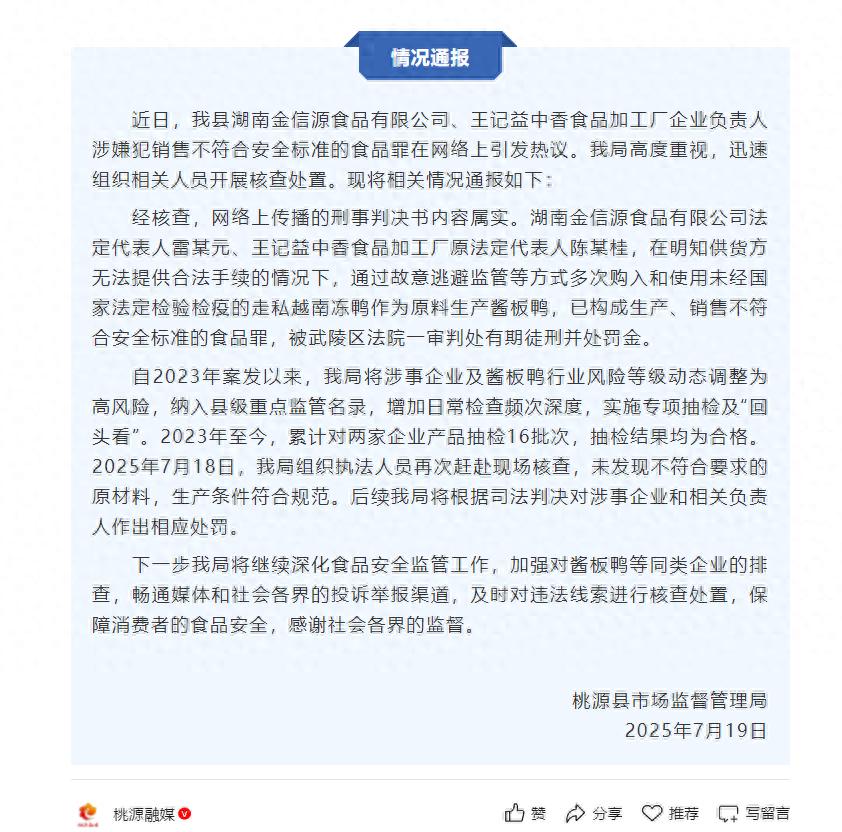 自2023年案发以来,我局将涉事企业及酱板鸭行业风险等级动态调整为高风险,纳入县级重点监管名录,增加日常检查频次深度,实施专项抽检及“回头看”。2023年至今,累计对两家企业产品抽检16批次,抽检结果均为合格。2025年7月18日,我局组织执法人员再次赶赴现场核查,未发现不符合要求的原材料,生产条件符合规范。后续我局将根据司法判决对涉事企业和相关负责人作出相应处罚。