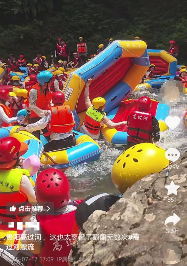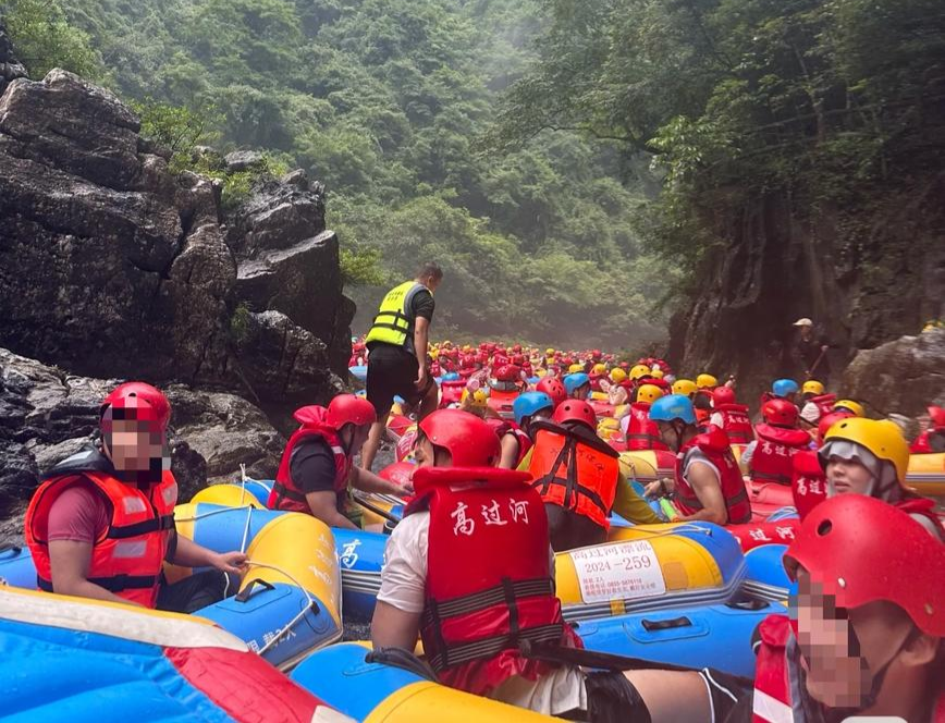 “人流量很大,船只堵在一起确实危险。我坐的漂流船被撞翻了两次,后面我直接弃船走到终点。”网友“黄豆酱”分享了她近日在高过河景区的漂流体验。从她分享的视频可以看到,水面上布满了漂流的皮划艇,并不断有皮划艇从上游下来,刚碰上漂流队伍,船就被撞翻了,场面很混乱。