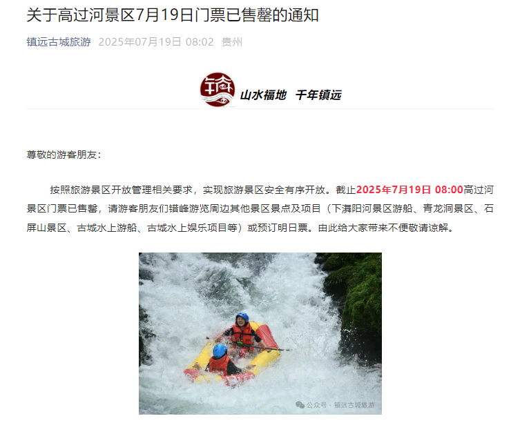 “镇远古城旅游”微信公众号发文称,按照旅游景区开放管理相关要求,实现旅游景区安全有序开放。截至2025年7月19日8点,高过河景区门票已售罄,请游客朋友们错峰游览周边其他景区景点及项目(下㵲阳河景区游船、青龙洞景区、石屏山景区、古城水上游船、古城水上娱乐项目等)或预订明日票。