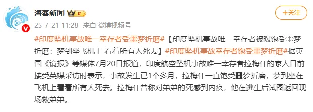 据英国《镜报》等媒体7月20日报道,印度航空坠机事故唯一幸存者拉梅什的家人日前接受英媒采访时表示,事故发生已1个多月,拉梅什一直饱受噩梦折磨,梦到坐在飞机上看着所有人死去。拉梅什曾称对弟弟的死感到内疚,他在逃生后试图返回现场救弟弟。