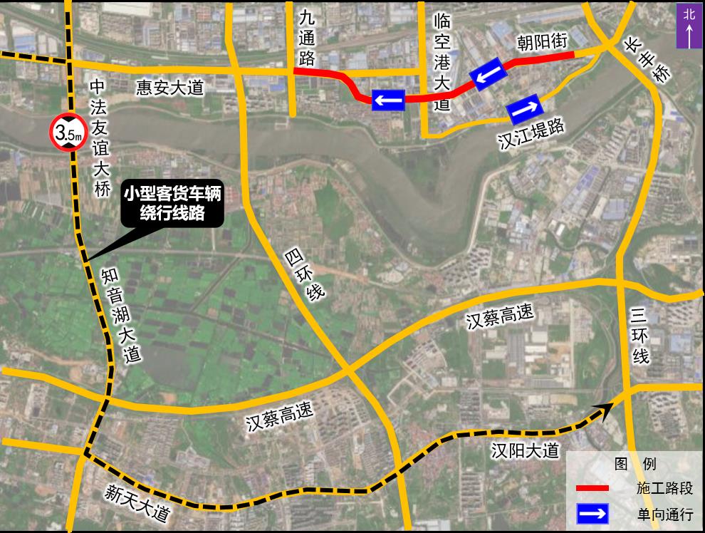 为减少道路交通压力,建议经朝阳街前往三环线汉阳方向的小型客货车辆绕行中法友谊大桥、知音湖大道、新天大道、汉阳大道等周边道路。