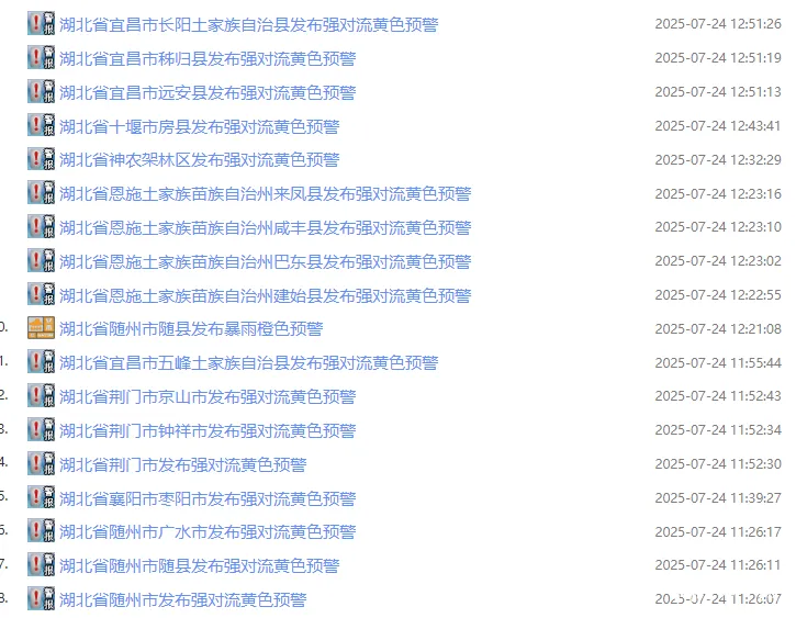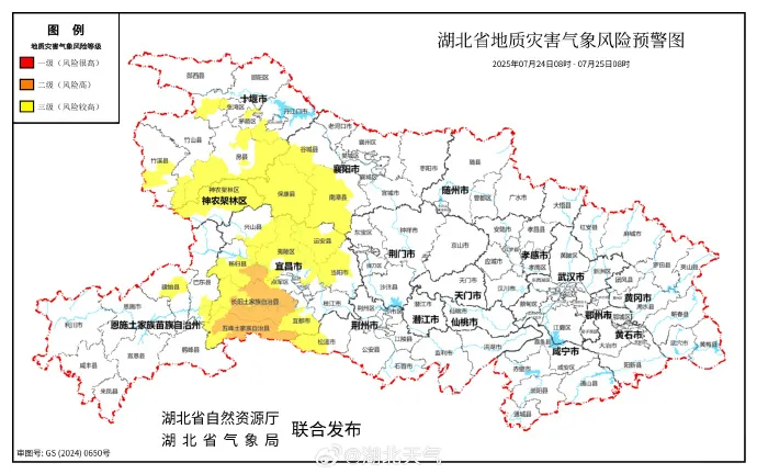 2025年07月24日08时-2025年07月25日08时,因前期累计降水强度较大,预计三峡库区(兴山县东南部、秭归县南部和东部、夷陵区大部),神农架林区,十堰(茅箭区北部、张湾区西部、郧阳区西南部、竹溪县中南部、竹山县南部、房县南部、中部和东部、丹江口市西南部)、襄阳(谷城县西南部、保康县、南漳县大部)、宜昌(点军区、远安县、当阳市西部和中部、长阳土家族自治县西部、五峰土家族自治县西部、宜都市中部和南部)、恩施(巴东县南部、建始县中北部)、荆州(松滋市西部) 以及其他强降水区域发生崩塌、滑坡、泥石流的风险较高;