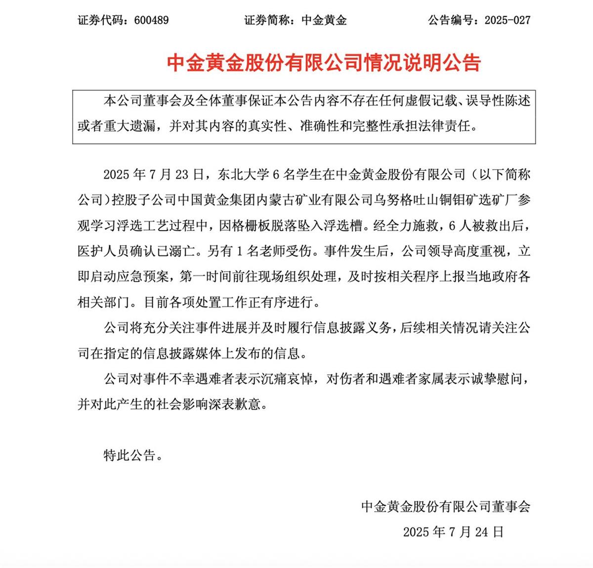 7月23日10时20分许,东北大学6名学生在中国黄金集团内蒙古矿业有限公司乌努格吐山铜钼矿选矿厂参观学习浮选工艺过程中,因格栅板脱落坠入浮选槽。经全力施救,6人被救出后,医护人员确认已溺亡。另有1名老师受伤。据媒体报道,中金黄金证券部工作人员在接受采访时称,涉事矿厂已经停产,正在抓紧处理善后工作,复产时间需等待主管部门确认。7月24日,极目新闻记者了解到,在该事件发生后,7月24日,已有矿企发布加强新员工安全管理的紧急通知。
