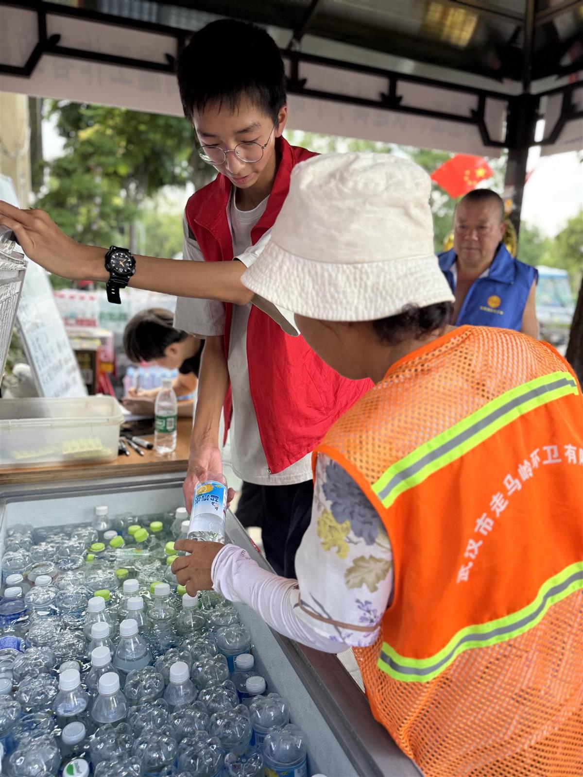 上午10点多,环卫工人杨师傅熟练地到冰柜前取水。“这冰柜我熟,年年夏天都开。天太热了,每天路过都要来拿瓶水。”杨师傅说。走马岭街物流园区密集,外卖员、快递员等新就业群体穿梭不息。刚停下车准备取水的饿了么骑手宋先生,不仅拿到了水,还收到了志愿者塞过来的“爱心馒头”。“我们整天在外面跑,能停下来喝口水,真的特别感谢他们。”宋先生感慨道。