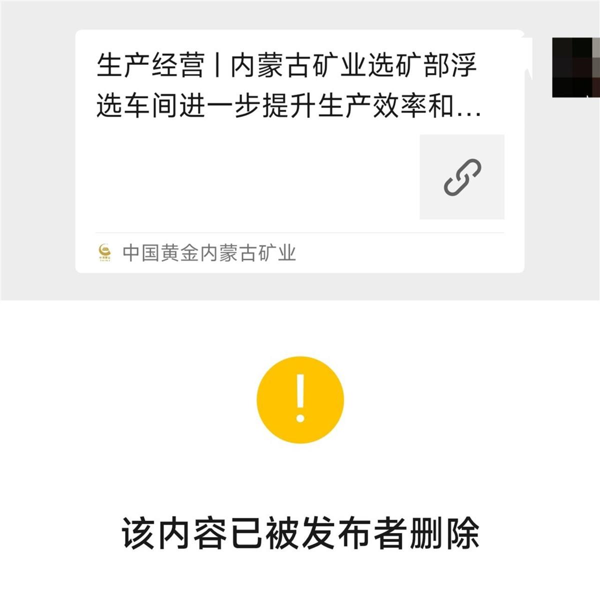 另外,7月8日,上述官微发布的文章《内蒙古矿业:不遗余力抓生产,全力以赴保障选矿生产指标稳定攀升》也删除了。