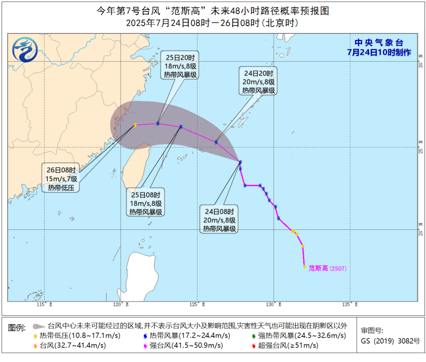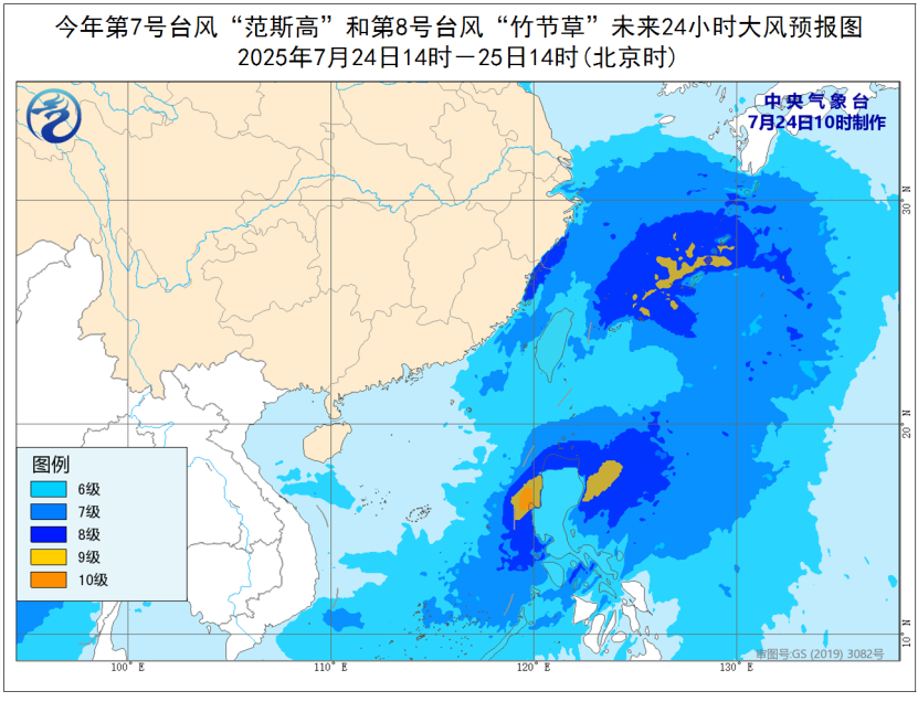 受“范斯高”和“竹节草”的共同影响,7月24日至25日,东海大部、台湾海峡、台湾以东洋面、巴士海峡、南海东部和南部、杭州湾、浙江沿海、福建沿海、台湾岛沿海将有6至8级、阵风9至10级大风,其中,南海东部的部分海域风力可达9至10级、阵风11至12级。