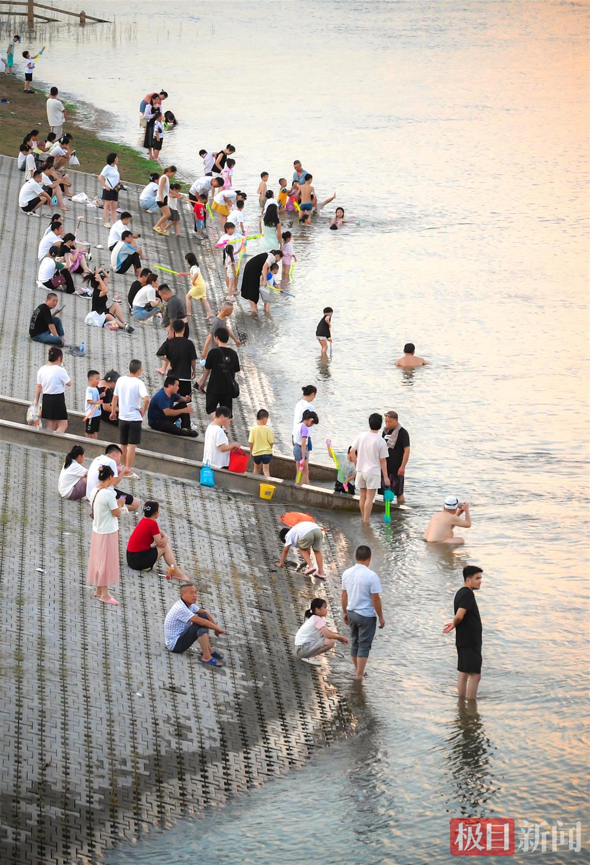 7月24日傍晚,武汉的汉口江滩成了市民消暑纳凉的好地方。这里人头攒动,江水漫过脚踝,裹挟着浮萍的浪涛拍打着岸边,带来阵阵清凉。