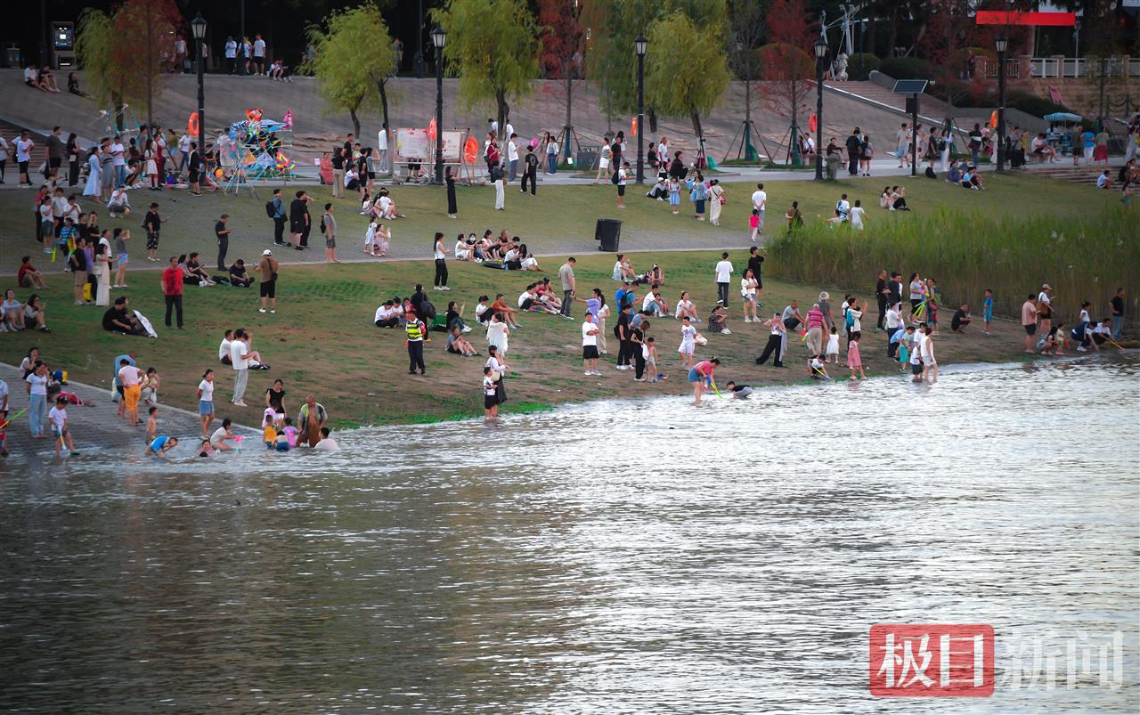 放眼望去,武昌江畔的楼宇在水雾中若隐若现,与波光粼粼的江面构成一幅朦胧画卷。江边孩童们手持水枪追逐嬉戏,飞溅的水花在夕阳下折射出彩虹;年轻情侣手牵着手漫步浅滩,脚印被江水温柔抚平;更多市民挽着裤腿踏浪嬉闹,笑声与浪涛声交织回荡,这里有大海的味道,市民在这里收获着清凉与欢乐。