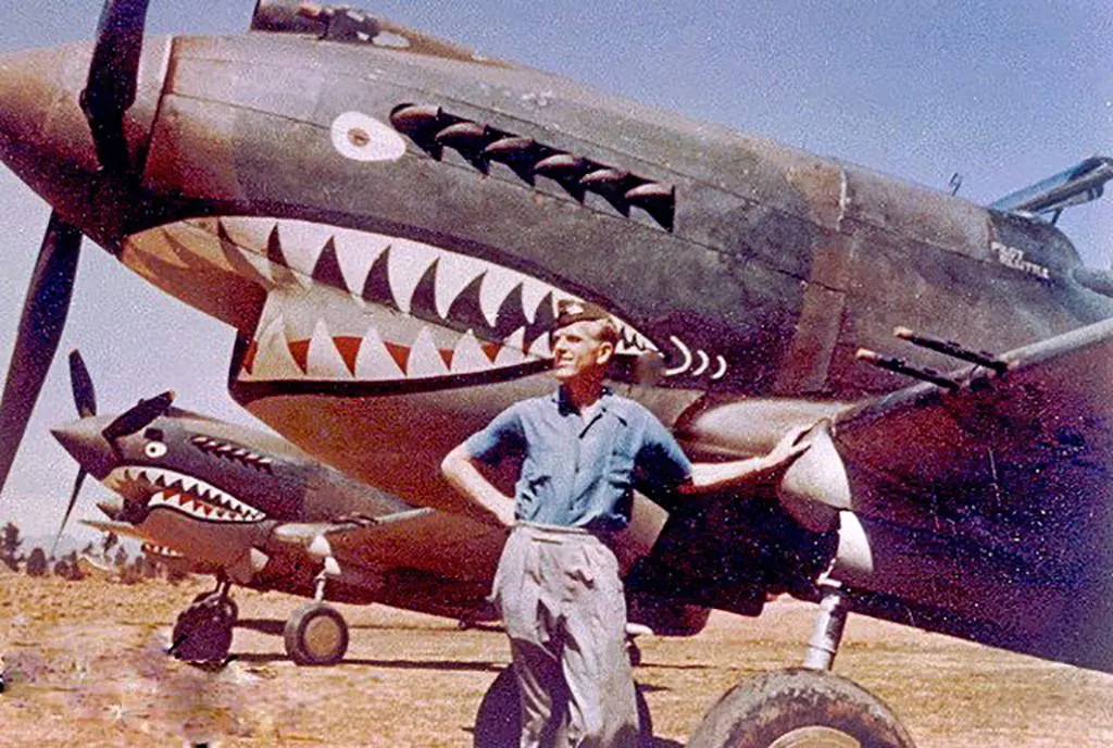 二战时期的昆明巫家坝机场,一名“飞虎队”队员在涂装有“鲨鱼嘴”标志的战斗机前留影的资料照片 据新华社