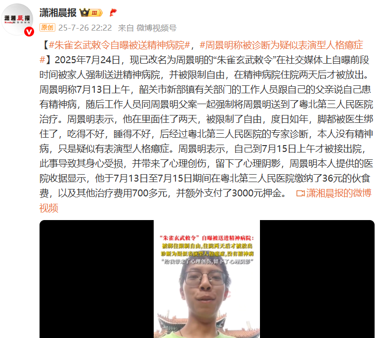 2025年7月24日,现已改名为周景明的“朱雀玄武敕令”在社交媒体上自曝前段时间被家人强制送进精神病院,并被限制自由,在精神病院住院两天后才被放出。