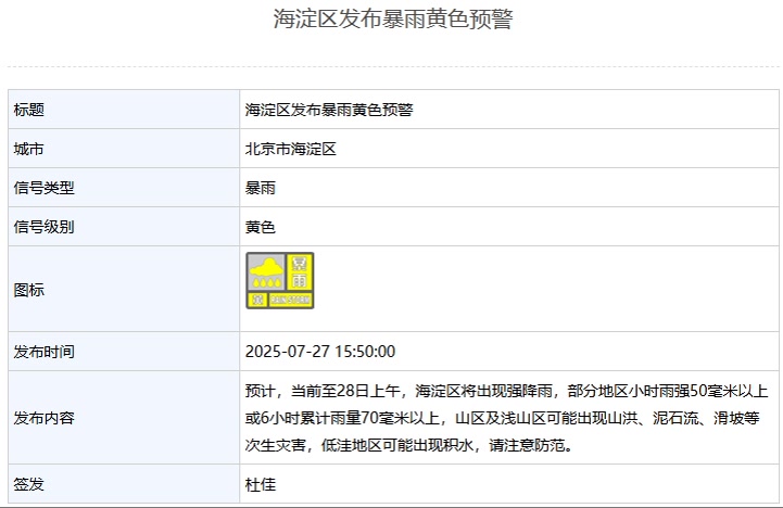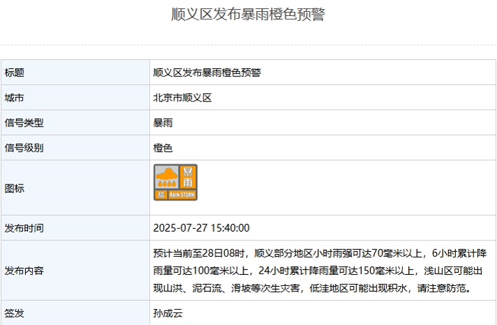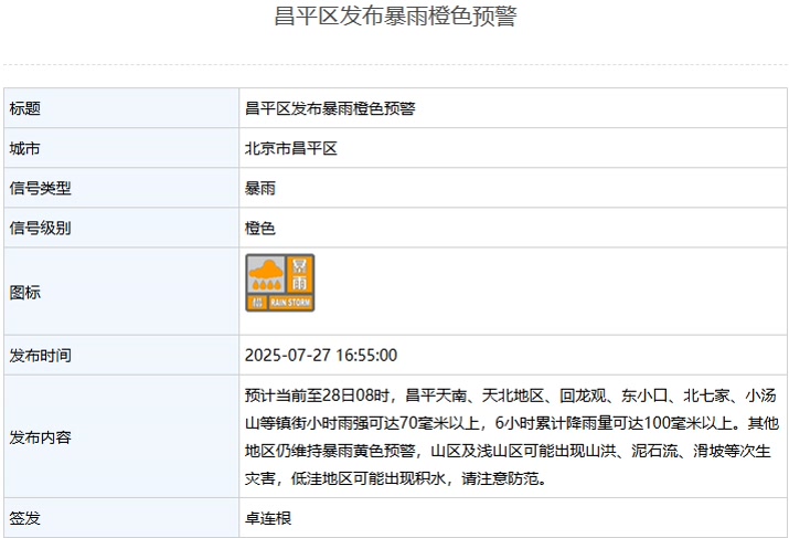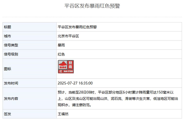 7月27日下午,北京多区升级发布暴雨预警!其中平谷区发布暴雨红色预警,昌平、通州、朝阳、顺义、大兴发布暴雨橙色预警,海淀发布暴雨黄色预警,请大家注意防范!