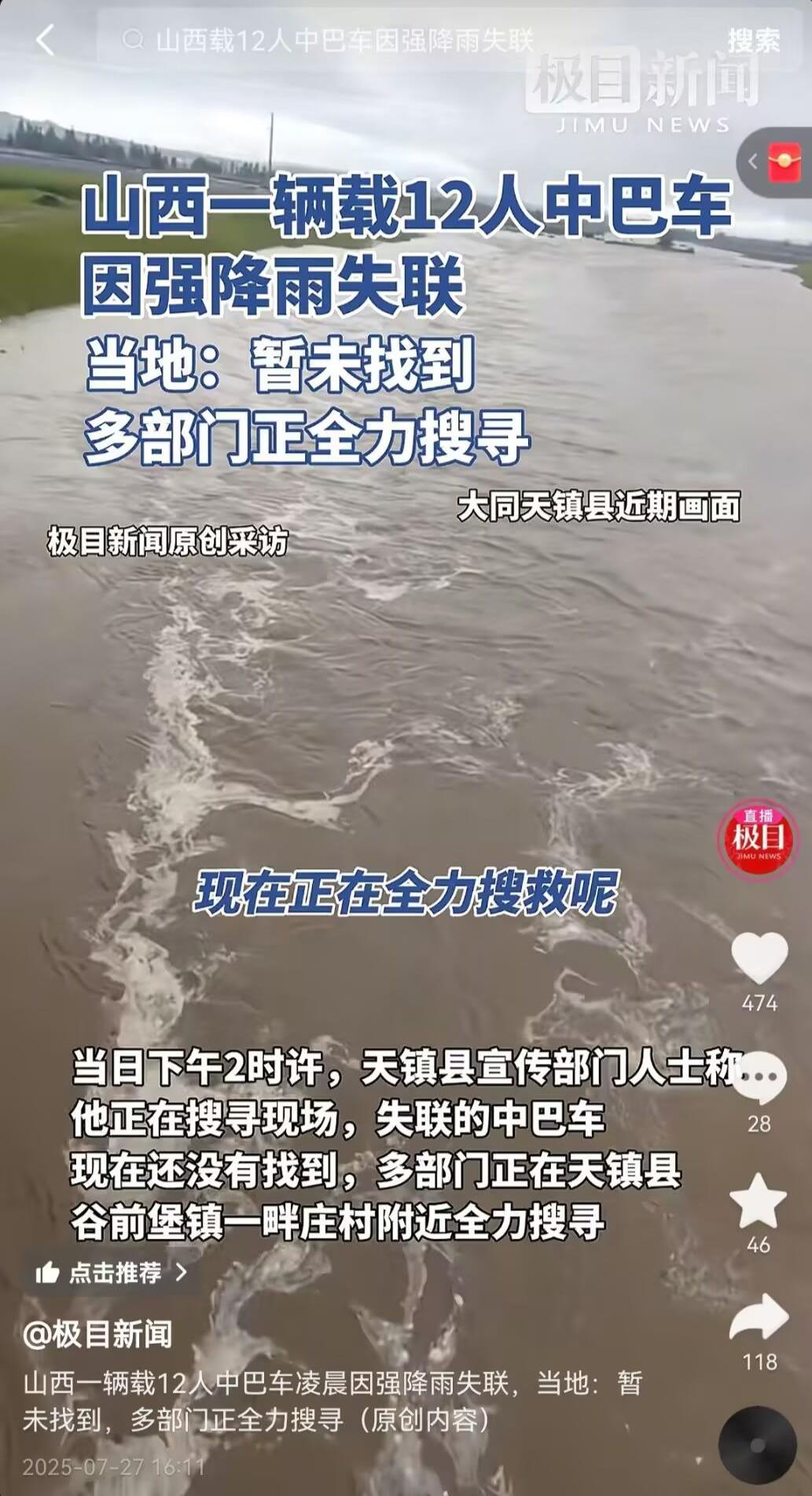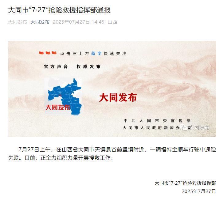 据大同发布7月27日下午2时45分通报:当日上午,在山西大同市天镇县谷前堡镇附近,一辆福特全顺车行驶中遇险失联。今晚近8时,当地村民告诉极目新闻记者,失联的12人不是同一个村的,分属不同的村。目前,各方救援力量正在连夜搜救。