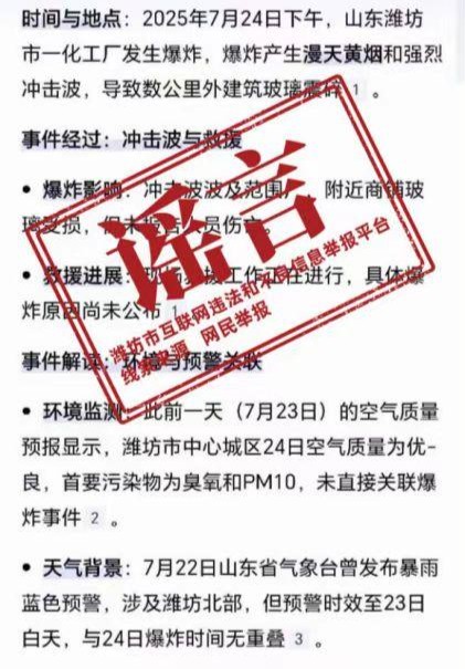 近日,有网民引用AI生成文章称2025年7月24日潍坊发生爆炸事故。经核实,网民听到的巨响为飞机音爆,网络上流传“潍坊市发生爆炸事故”的说法是谣言。