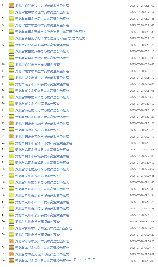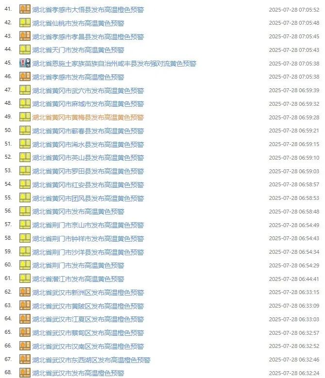 湖北省气象台2025年07月27日15时26分发布高温黄色省级预警:
