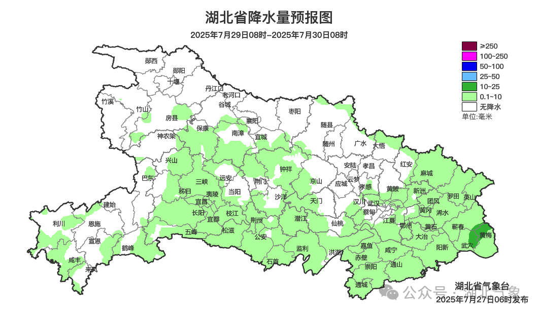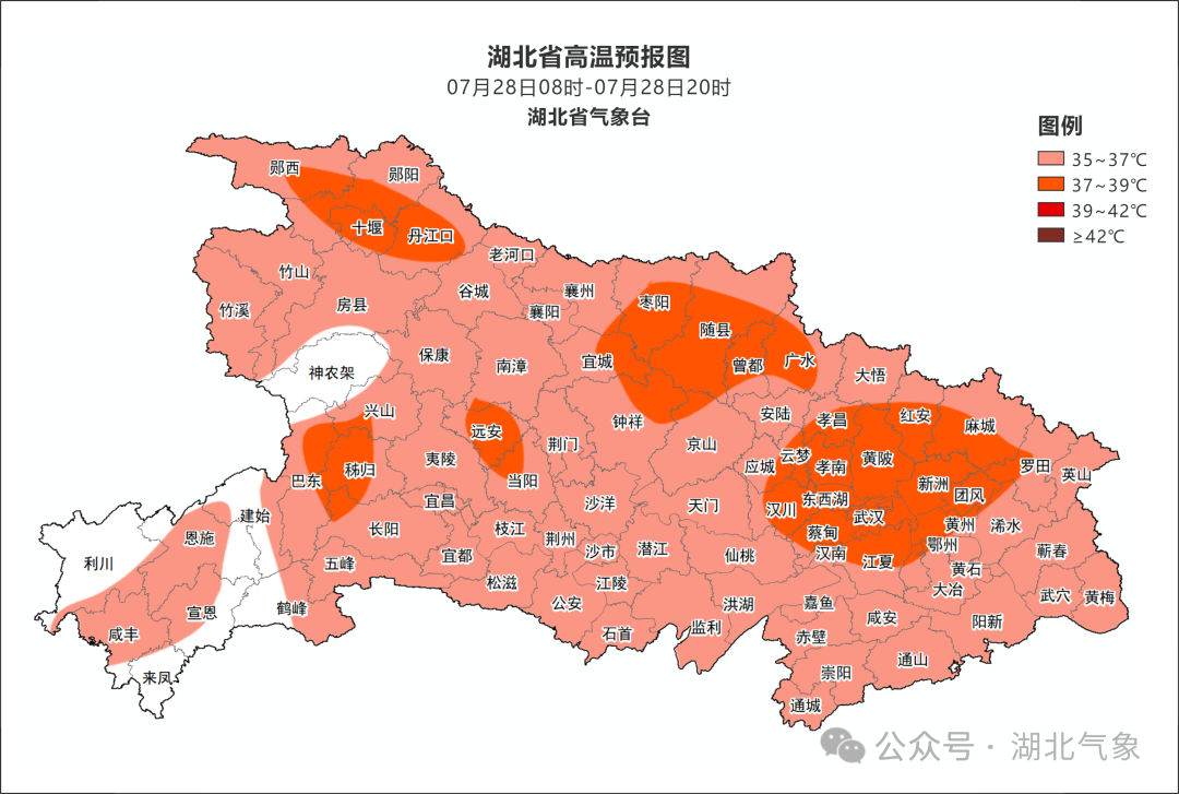 天气预报 7月28日08时-29日08时,全省晴天到多云,有分散性阵雨或雷阵雨。最高气温34~39℃,最低气温西部23~26℃、中东部27~29℃,偏北风3级、阵风4到6级。 7月29日08时-30日08时,全省晴天到多云,有分散性阵雨或雷阵雨。最高气温34~39℃,最低气温西部24~26℃、中东部27~29℃,偏北风3级、阵风4到6级。 7月30日08时-31日08时,晴天到多云,局地有阵雨或雷阵雨。气温 28~36℃、城区最高气温 37~38℃,偏北风3级、阵风4到5级。 未来一周湖北高温天气不停歇 提醒公众持续做好防暑降温措施 随身携带雨具,以防阵雨突袭 来 源:长江云新闻综合湖北气象