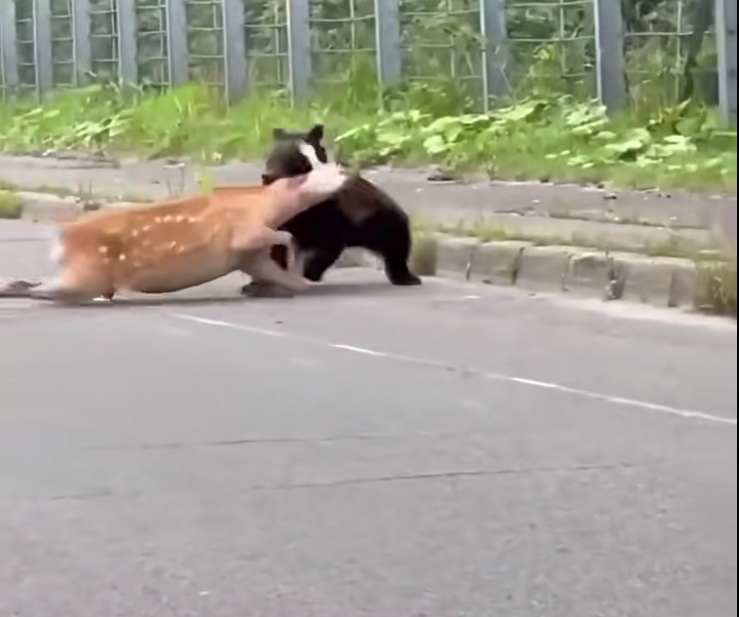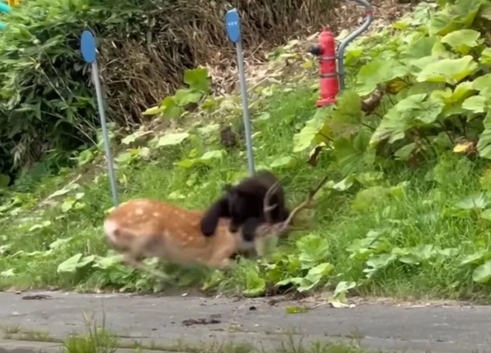 7月27日,日本北海道一头熊在国道上袭击一只鹿并将其拖入草丛,袭击全程被拍下。熊咬住鹿的脖子,将发出哀鸣的鹿拖到路边的草丛,随后开始啃食。