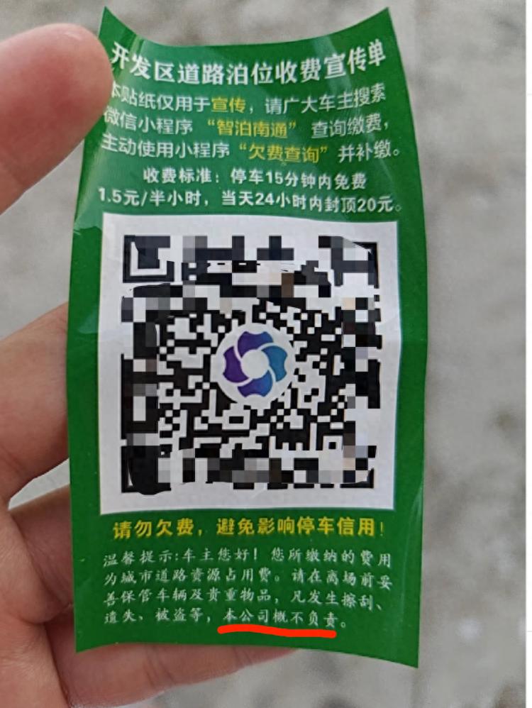 近日,江苏南通开发区部分道路投放的停车收费宣传单引发热议。宣传单上虽印有缴费二维码和收费标准,却在醒目位置标注“车辆擦刮、遗失、被盗等,本公司概不负责”。该宣传单在社交平台引发关注。有网友表示:“收了钱还不负责,这是什么道理,不懂了。”也有网友调侃:“收费不含服务,却连最基本的看管都不管,出了事还‘概不负责’,那收的是什么钱?”