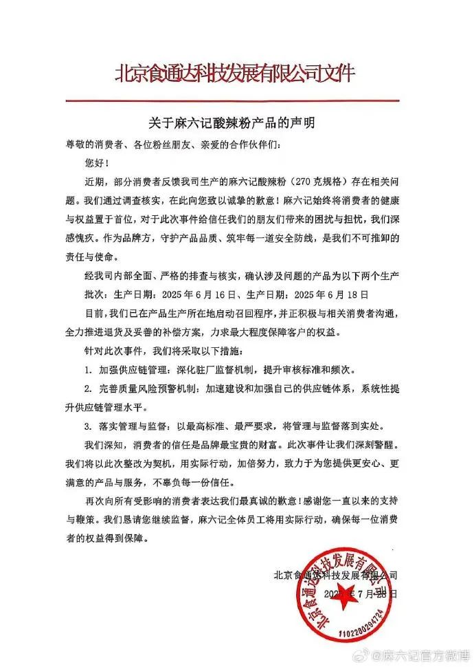 28日下午,@麻六记官方微博 公开发表声明向消费者道歉,称经公司内部排查与核实,确认涉及问题的产品为生产日期为2025年6月16日、生产日期为2025年6月18日的两个生产批次。
