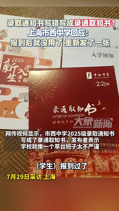 据大象新闻7月29日报道,近日网传一视频显示,上海市西中学2025级录取通知书写成了“录通取知书”,发布者表示学校不太严谨。