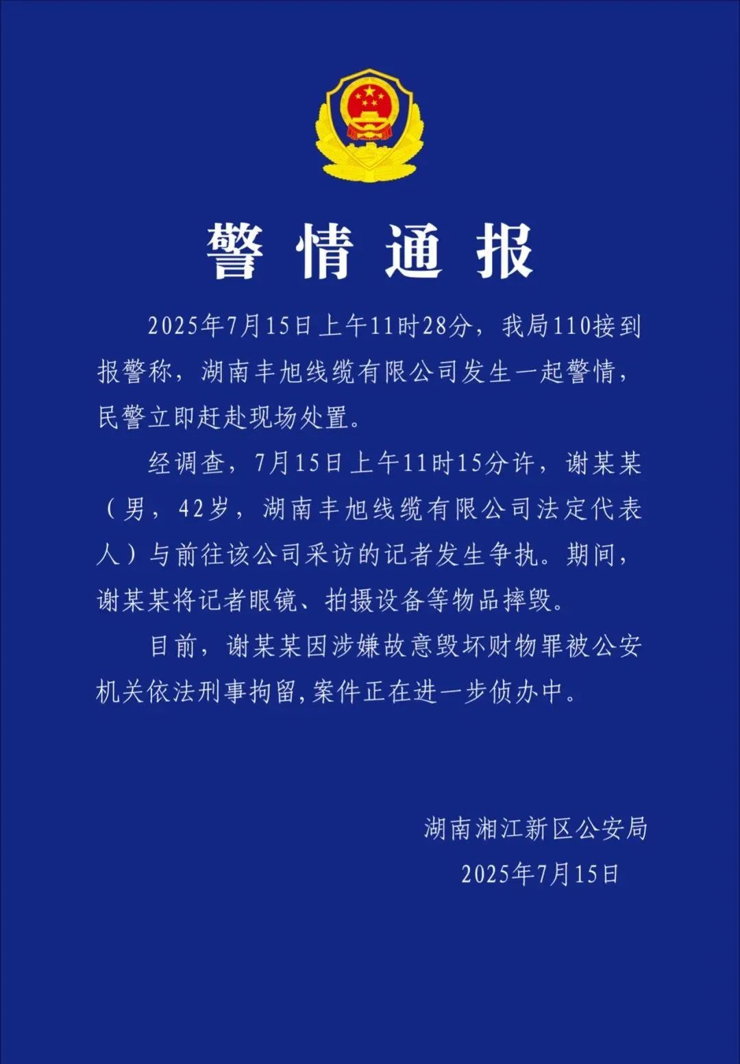 7月15日,因在采访中被质疑电缆质量不达标,湖南丰旭线缆有限公司负责人谢某陪暴力打砸媒体记者摄像机等采访设备,当晚被警方刑拘,而该公司产品被曝曾投入长沙地铁6号线使用,引发公众关注。当地质监部门称已进行抽检,后续将就抽检结果发布公告。