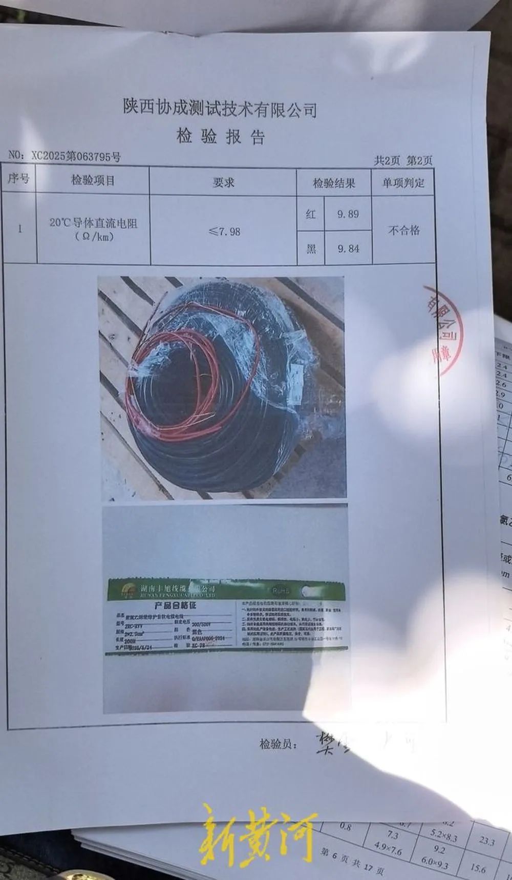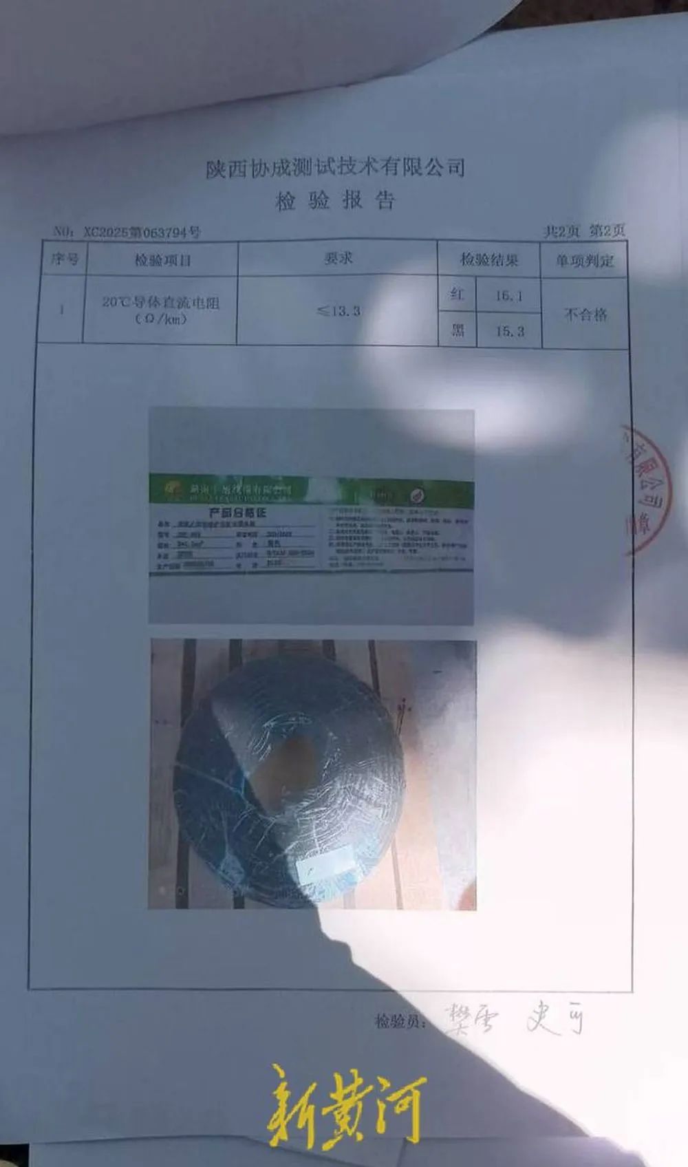 新黄河此前报道,日前,经营一家农家乐的消费者陈先生在湖南丰旭线缆有限公司购买了一批电缆,准备为其农家乐增加灯光效果,不料电工安装时告知其购买的线缆过细,可能会在后续引发火灾。陈先生重新下单两个规格的产品,要求湖南丰旭线缆有限公司直接寄往陕西协成测试技术有限公司进行检测。但检测结果显示,丰旭公司产品不仅低于国家标准,也并未达到该公司提供的企业标准。