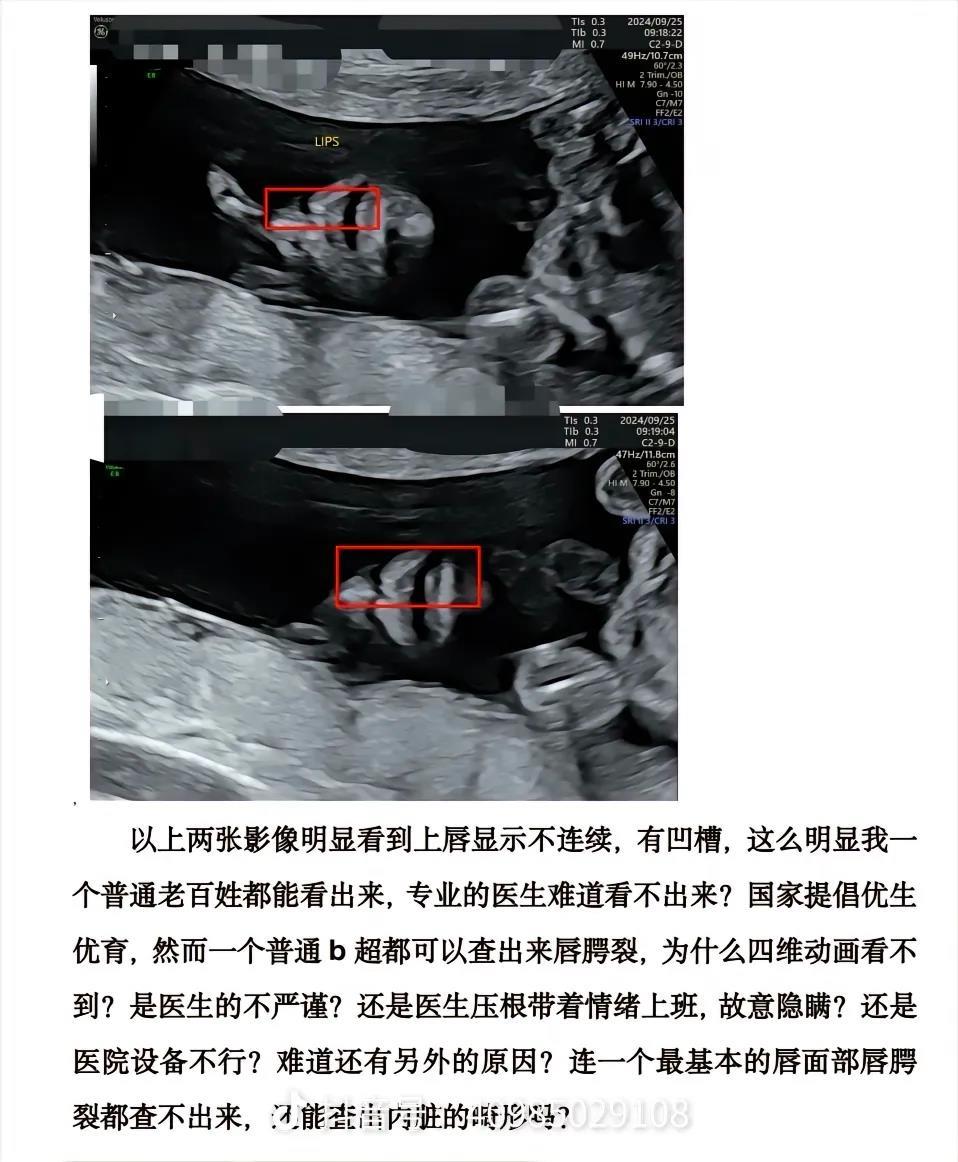 极目新闻记者注意到,当事人发视频称,2024年6月26日,她在桂林市妇幼保健院建档进行孕检,整个产检过程都在该医院进行,产检显示胎儿一切正常,但孩子出生后却被诊断为先天性畸形二度唇腭裂,伴有牙槽裂等。后来其查看四维图,发现孩子嘴唇有明显的缺口,红唇不连续,但在产检过程中医院并未告知孩子存在问题。她到医院请求封存病历被拒,并投诉到卫健委,线下去提交材料时,遭卫健委工作人员怒斥。