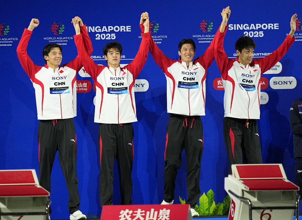8月1日,由季新杰、潘展乐、汪顺、张展硕(从左至右)组成的中国队在颁奖仪式上。新华社记者 夏一方 摄