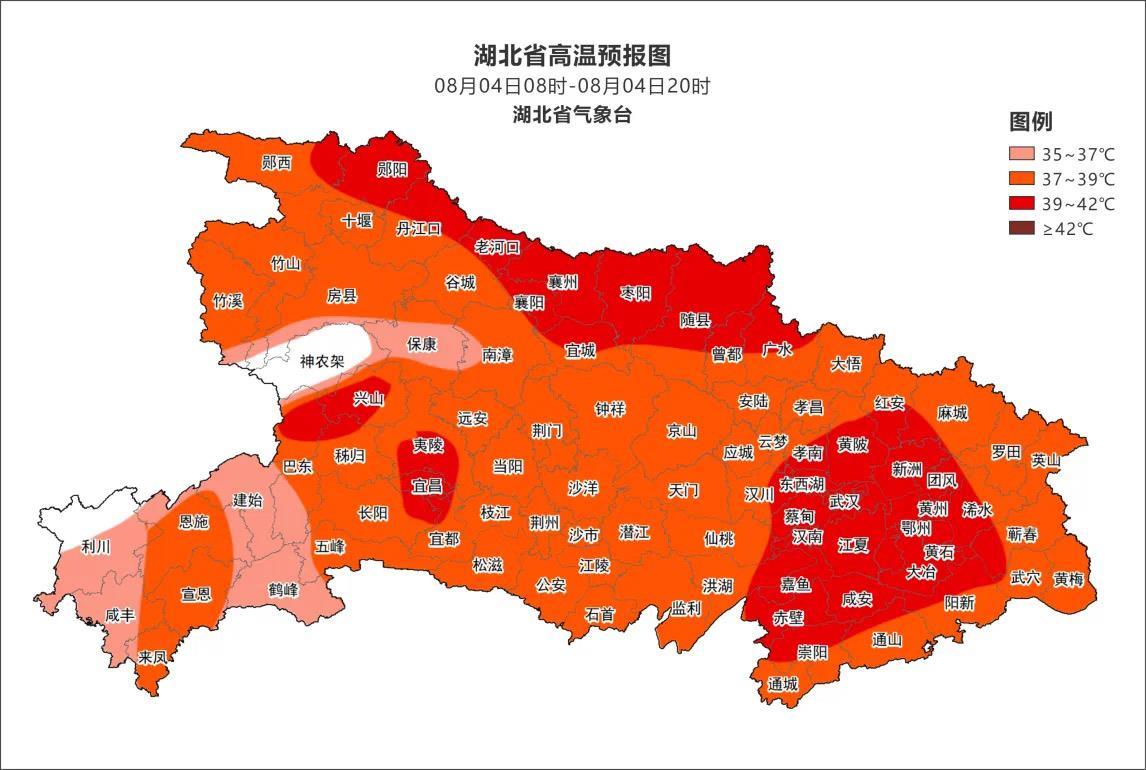 预计8月4日白天,除西部高海拔地区外,湖北省大部分地区最高气温将升至37℃以上,其中十堰、襄阳、随州、恩施、宜昌、孝感、武汉、鄂州、黄冈、黄石、咸宁局地可达39℃以上,请注意防范。