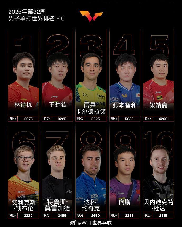中国队球员林诗栋、王楚钦位列前二,梁靖崑位列第五,向鹏位列第九。