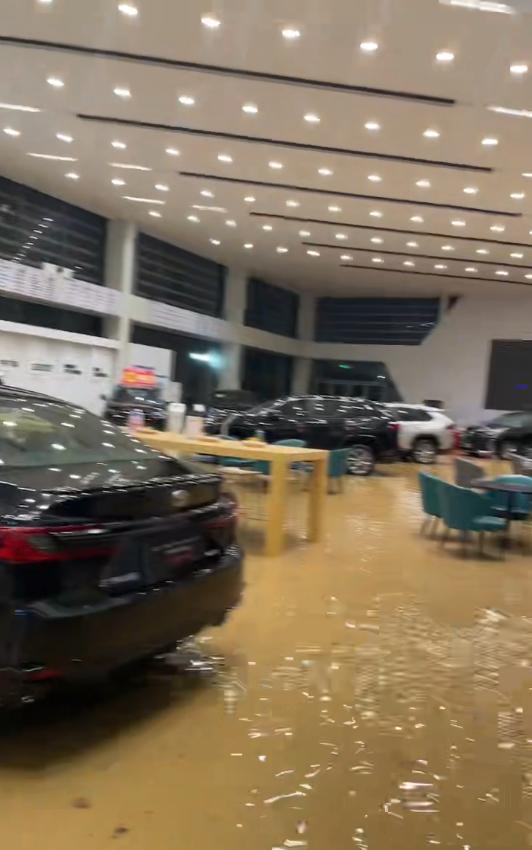 另有现场视频显示,沿街部分商户被淹,有人挽起裤腿蹚水而行。一处售车大厅也被水淹,里面的新车遭洪水浸泡。
