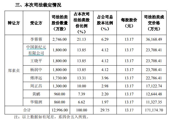 此次司法拍卖中,郑素贞所持股份的所有权分别归李蓉蓉(2746万股)、中国新纪元有限公司(1800万股)、周正昌(1300万股)、王晓平(1800万股)、杨润中(1800万股)、傅泽远(1730万股)、黄鹂(960万股)及华锦洲(860万股)所有。