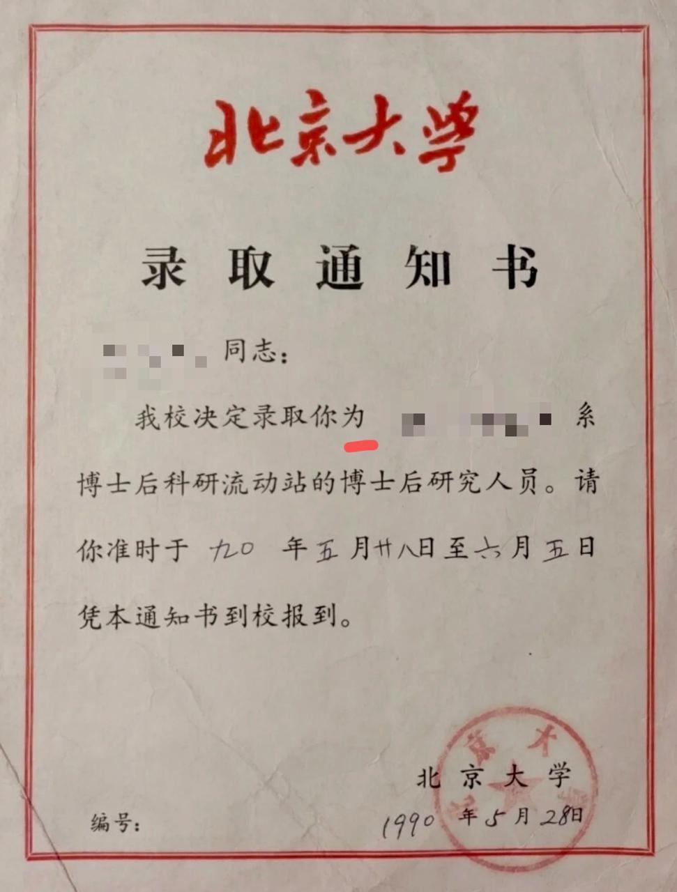 记者进一步搜索发现,一份1990年的北京大学博士后录取通知书(与本科录取通知书性质不同)表述为:“我校决定录取你为xx系博士后科研流动站的博士后研究人员。”(使用“录取为...”结构),并称呼为“xx同志”。