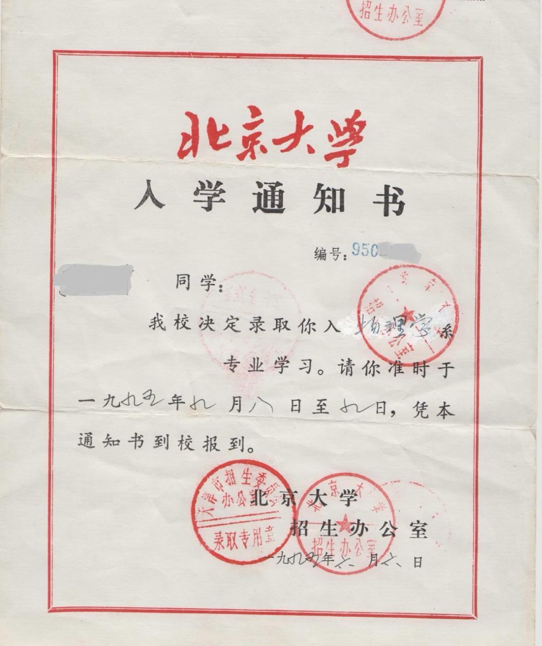 △网友晒出的1990年北京大学录取通知书。图源网络