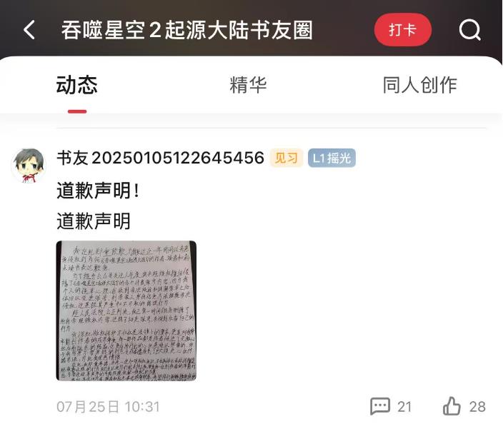 7月25日,叶某在起点读书《吞噬星空2:起源大陆》评论区发布道歉声明,表示尊重法院判决,为其长达近一年时间以来的恶意侵权行为向作者、读者和版权所有方表达歉意:“会以实际行动支持正版,尊重每一位创作者的辛勤付出。”