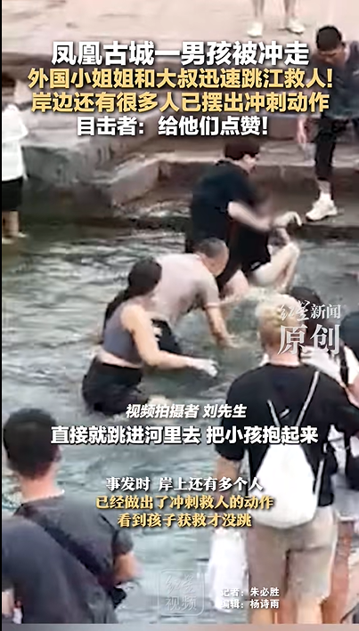 正在走石墩桥的女游客和岸上的大爷毫不犹豫地迅速跳下江,将男孩救上岸。视频拍摄者刘先生告诉记者,救人的女游客是一个外国人,大爷是孩子的爷爷。刘先生表示,当时小孩脑袋已经淹到水里去了,水流速度有点快。