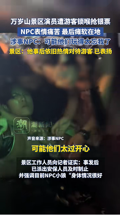 目击者称,事发8月7日,起因是游客哄抢工作人员手中道具。另一目击者称,当时一男游客突然从背后对工作人员锁喉、捂嘴,其他游客一同哄抢。