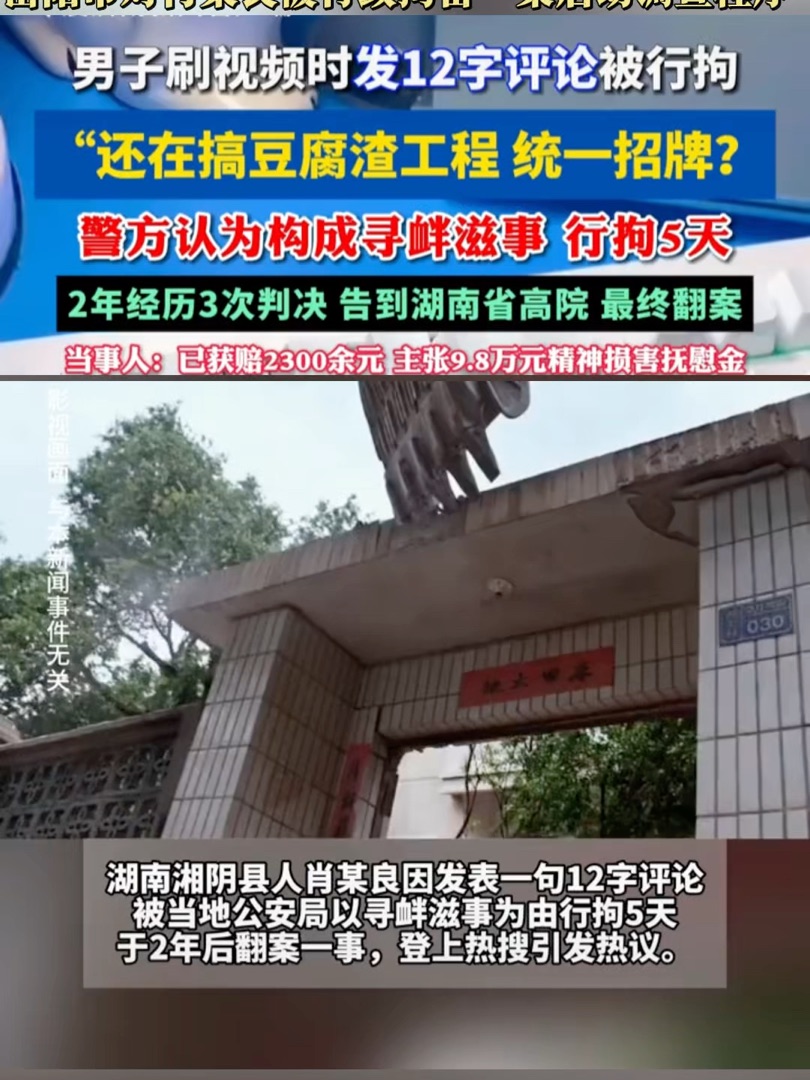 他没想到,这条12字的评论,给他带来了麻烦。7月7日,肖新良接到了公安局的传唤,在询问取证后,湘阴县公安局以其发表的评论为“不实言论”“在网络上起哄闹事”为由,认为其行为已构成寻衅滋事,根据《中华人民共和国治安管理处罚法》第二十六条规定,对其处行政拘留五日。