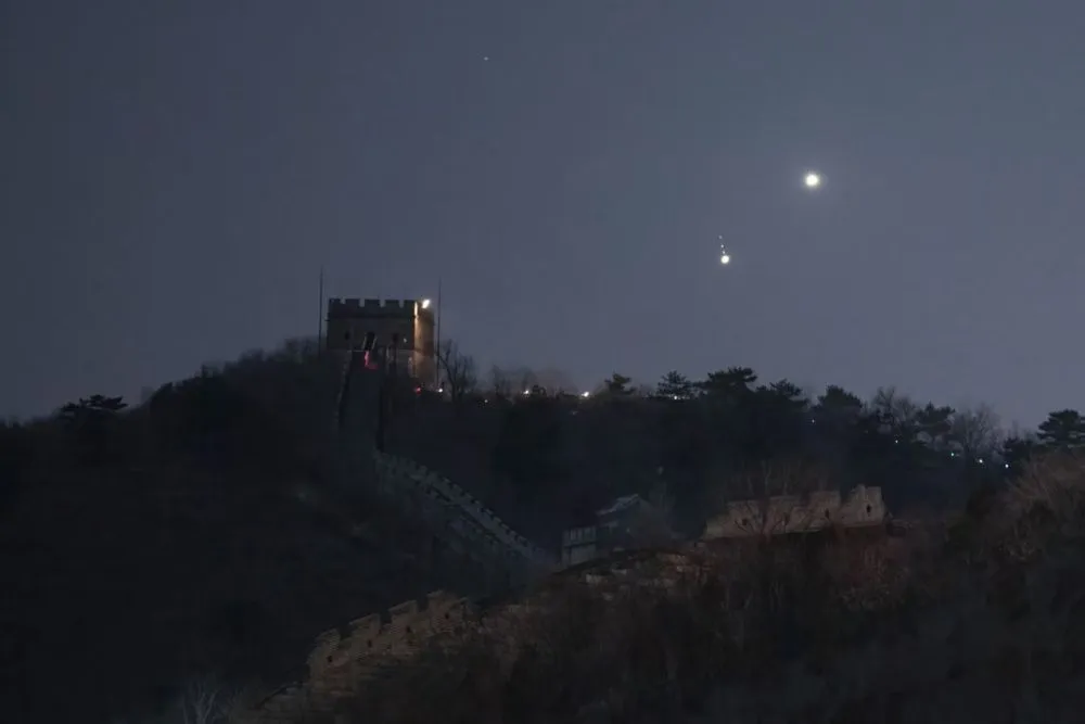 2023年3月2日,在北京怀柔区水长城拍摄的金(右上)木(左下)极近。(周博 摄)