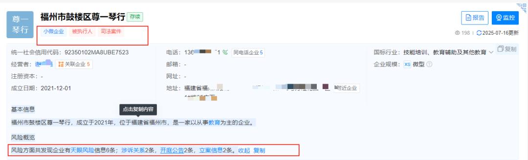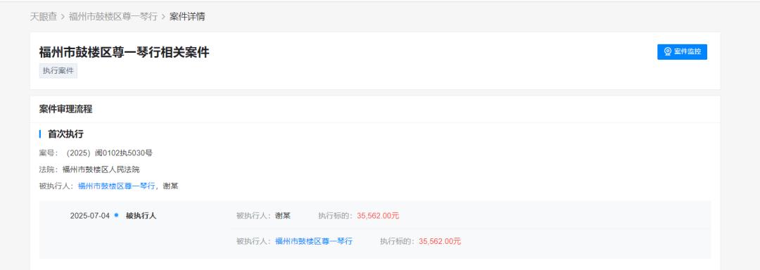 网友在爆料中晒出的信息显示,谢某某为个体工商户经营者,记者查询发现,谢某某名下的小微企业已被标注“被执行人”、“司法案件”等风险信息,平台提示存在“被执行人高风险”。具体而言,福州市鼓楼区人民法院记录显示,2025年7月4日,谢某某作为被执行人有一案件进入首次执行阶段,其姓名与被指控欠薪者一致,执行标的为35562.00元(约3.5万元)。