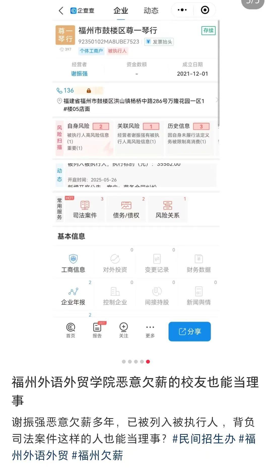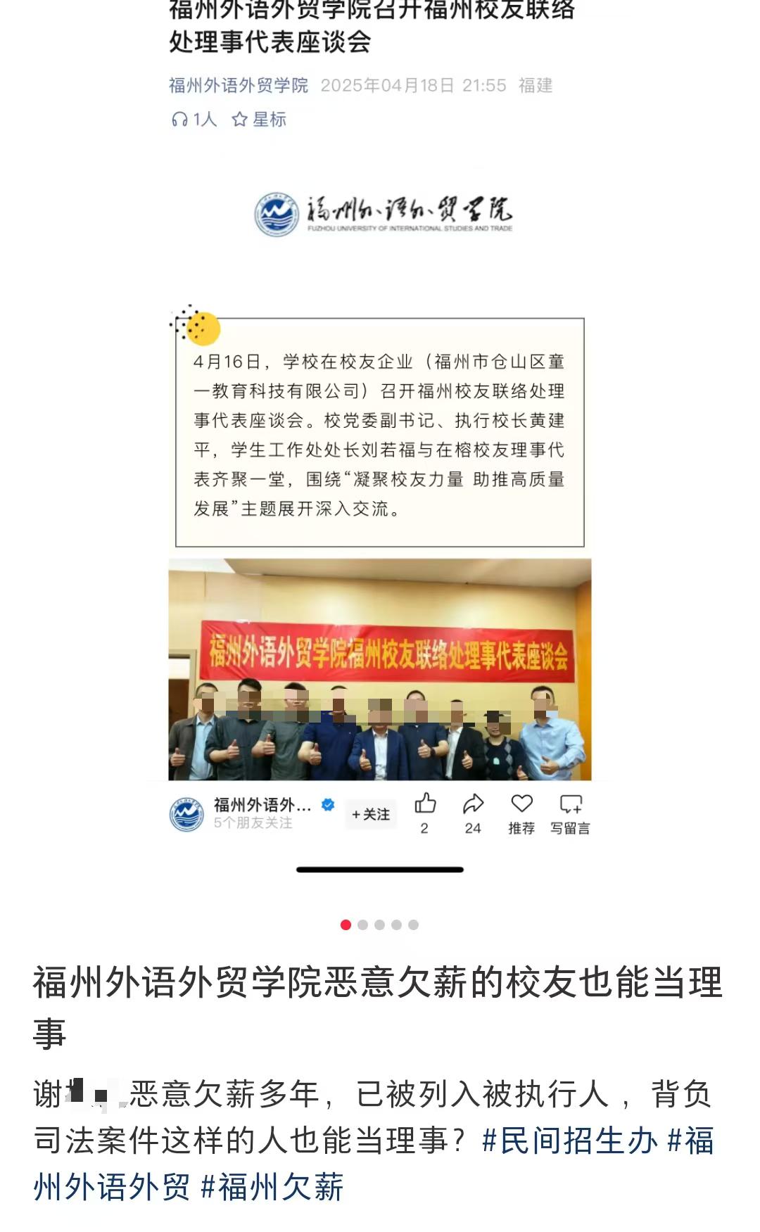 8月10日,有网友发帖指控福州外语外贸学院校友谢某某存在恶意欠薪行为,并称该校友目前仍担任福州外语外贸学院校友联络处理事代表。