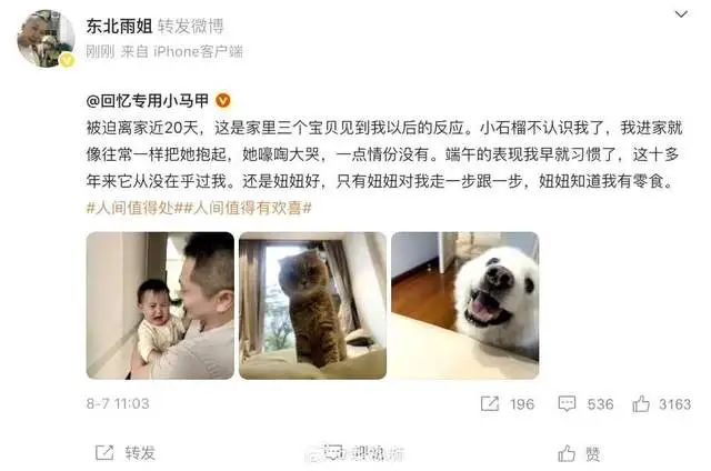 沉寂近一年后,东北雨姐于8月9日在微博打破沉默,转发博主“回忆专用小马甲”的动态,分享自家宠物见到离家20天的自己后的反应,配文“人间值得处”,字里行间流露感慨。此前,另有博主“金玉满堂”发布与东北雨姐合拍的视频,文案称“东北雨姐本人真的很好,大家莫要喷她,生活不易,讨生活而已”,疑似为其复出铺垫。