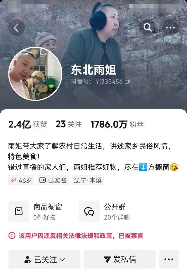据了解,东北雨姐曾凭借展现东北农村生活的系列视频在抖音积累千万粉丝,其人设憨厚爽朗,深受网友喜爱。然而,2024年,有打假博主曝光其直播间售卖的红薯粉条实为木薯淀粉制作,不含红薯成分,引发信任危机。官方随后介入调查,市场监督部门对其处以165万元罚款。同年10月,东北雨姐的抖音账号被依法禁言,目前罚款已缴纳。