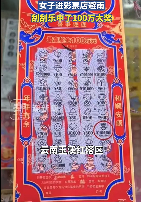 8月8日,云南玉溪。红塔区一家彩票店内一位前来避雨的购彩者,幸运刮中“喜相逢”即开票最高奖金100万元。据投注站业主回忆,中奖女士当时因大雨进店避雨,主动询问:“店里有刮刮乐吗?躲雨正好玩一下。”该女士随即购买了一整本刮刮乐,仅仅刮开第六张,就看到了票面上对应的奖金标识“1000000”!
