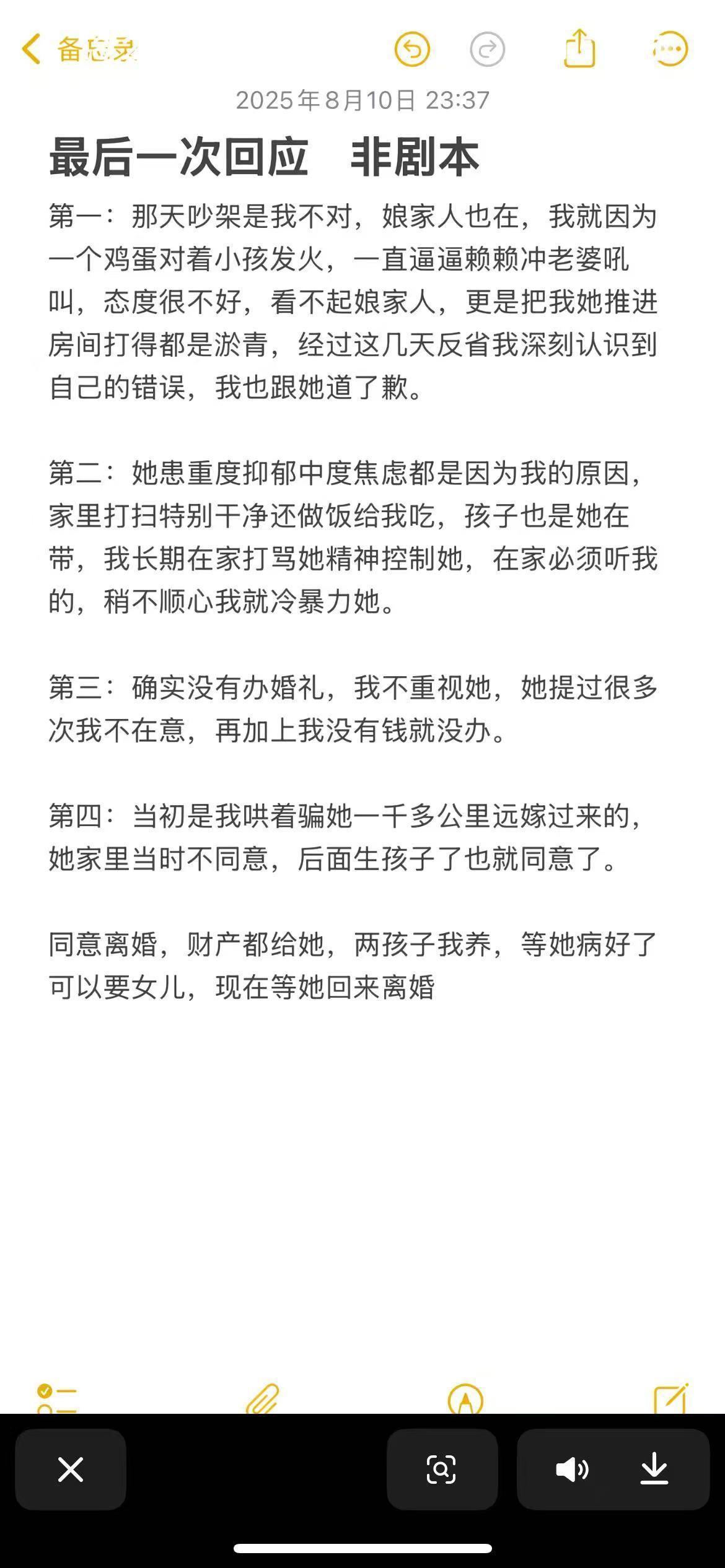 8月10日晚,网名为“山水”的网友发帖,自称是事件中的男方并发布道歉声明,声明称事件并非“剧本”,并向妻子道歉,他承认了一系列粗暴对待妻子的行为,并表示女方“患有重度抑郁症和中度焦虑症,都是“我的原因”,同时,他表示同意离婚,承诺将财产留给女方,并争取两个孩子的抚养权。